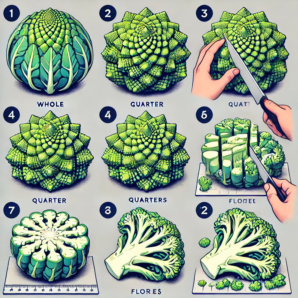 The diagram was full of mistakes! Step numbers were duplicated, one of the illustrations was repeated, and the cutting sequence made no sense. One drawing showed the romanesco chopped into florets, then suddenly it was halved vertically, then halved top to bottom again... none of it added up!