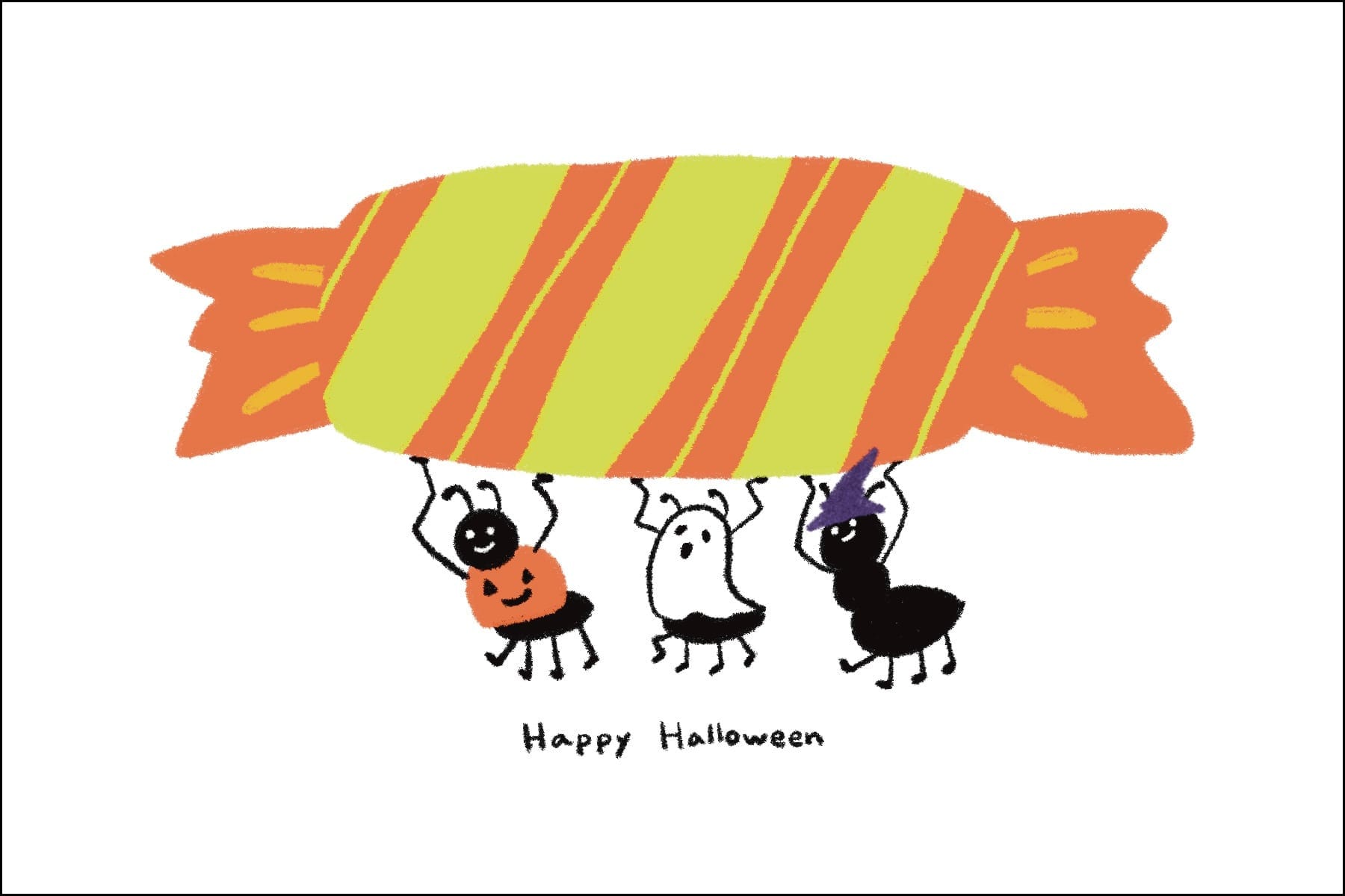 The second idea I picked was the ant one. When I showed it to my husband, he didn’t get the original phrase, so I decided to keep it simple and just go with “Happy Halloween.” I started redrawing everything to improve the expressions and poses, but then I remembered something I learned yesterday—tiny illustrations and delicate linework don’t really work well for risograph printing. So I tried drawing it by hand again, but I started to lose confidence and finally gave in and went back to Procreate.