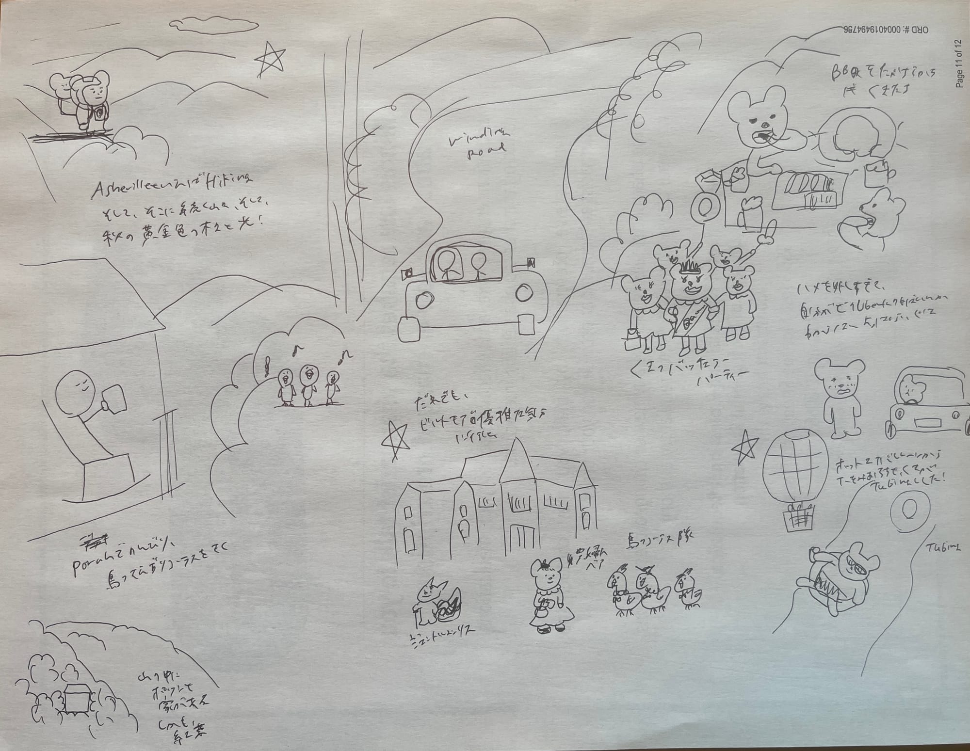 Today, I looked back at all the brainstormed ideas and image references from yesterday and narrowed things down. Then I started making some loose sketches. Asheville has its share of bear sightings, and I thought it might be fun to draw them in a more comical, light-hearted way—so I started doodling with that in mind. Another unique thing about Asheville is how birdsong echoes throughout the town, so I jotted down an idea about a chorus of birds too. I added a little star next to the ideas that felt the most promising, and that was the end of today’s session!