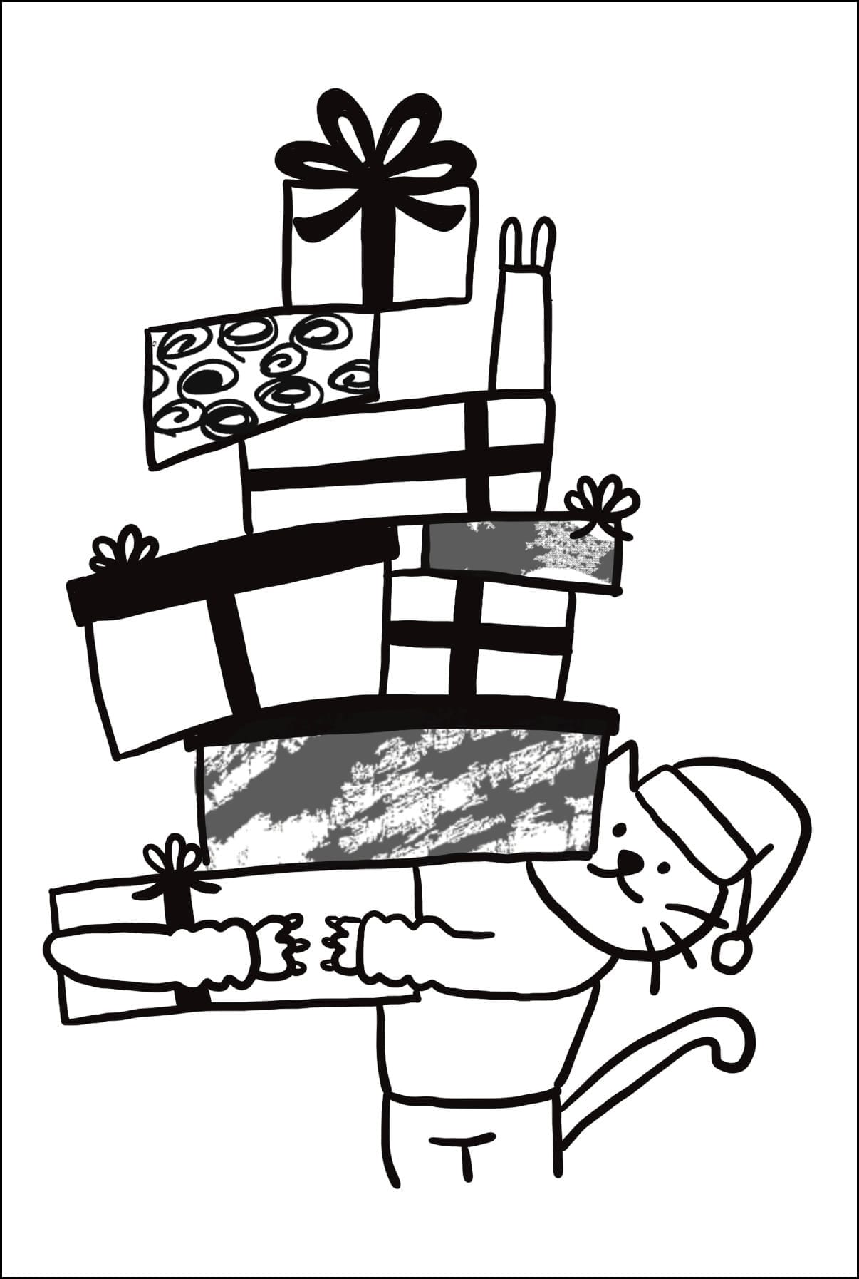 After thinking it over a bit more, I realized—maybe this comic doesn’t need a “story” at all. Maybe it’s more fun if it’s just a cat desperately trying out different ways to carry too many presents.