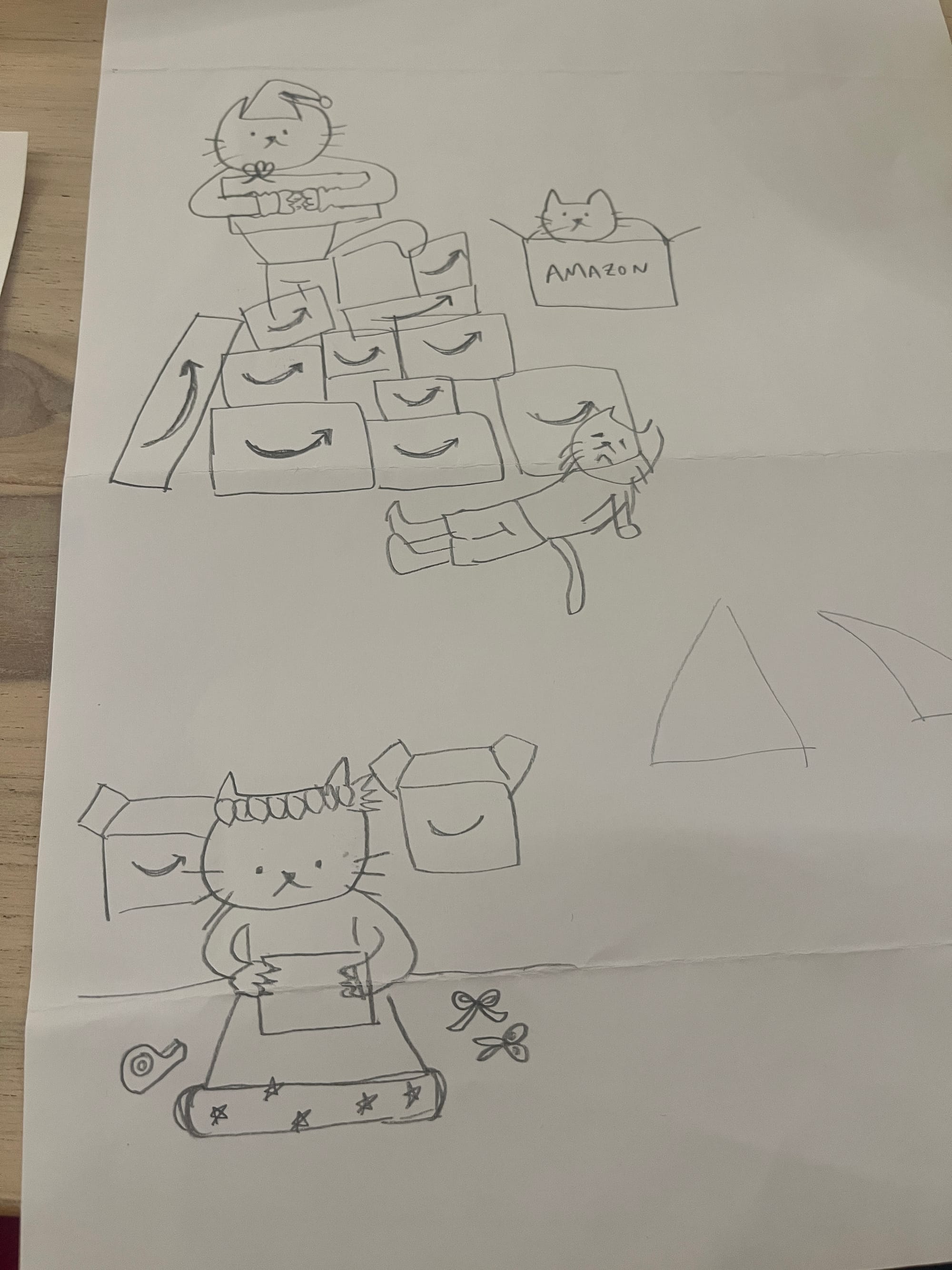 I briefly thought, “What about a cat wrapping presents, overwhelmed by all the Amazon boxes piling up?” But, it just didn’t feel right.