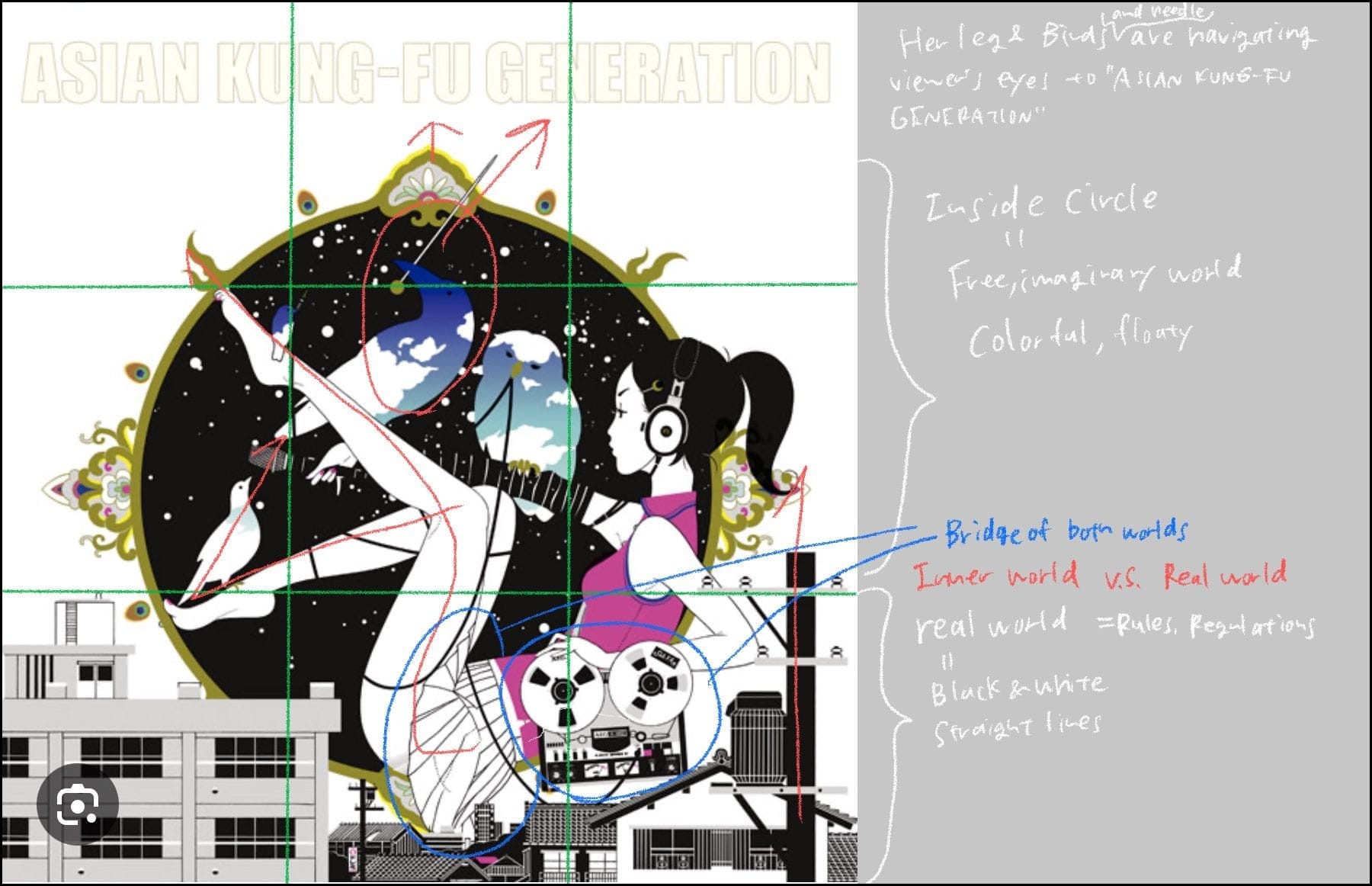 The piece that left the biggest impression on me was a cover illustration by Yusuke Nakamura for a Japanese rock band, Asian Kung-Fu Generation. It’s an album I used to listen to all the time as a student, so it already had a special place in my heart. But when I analyzed the composition of the cover, all those feelings from back then came rushing back. It really hit me that I had actually been receiving the message he embedded in that illustration—thanks to the composition he intentionally crafted. That realization gave me chills. Of course, I don’t know if I captured his intent 100%—but I feel like I got pretty close.