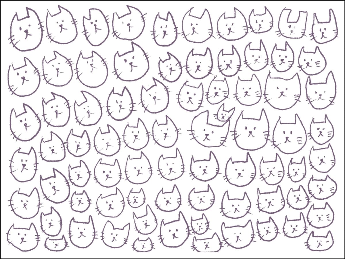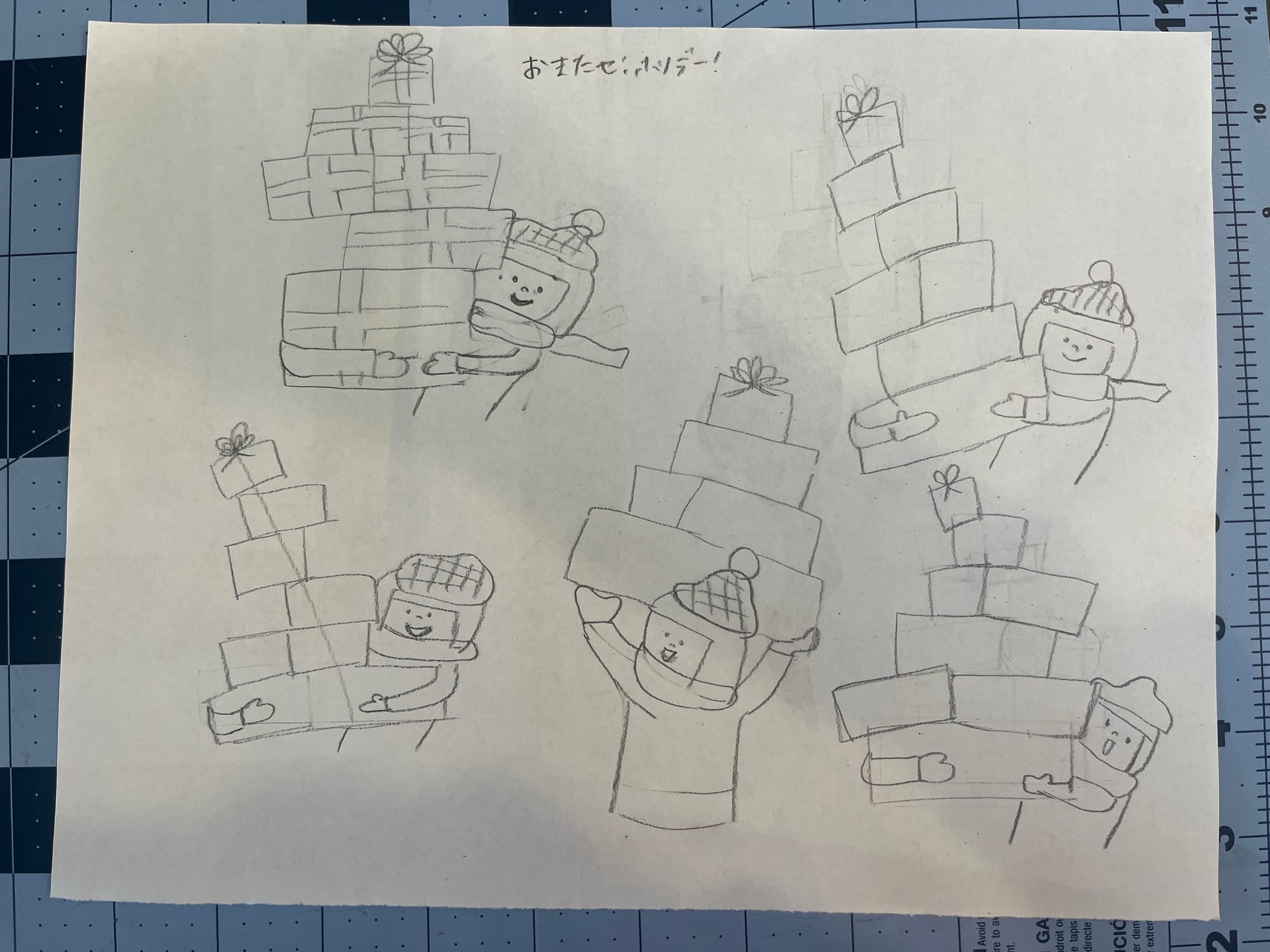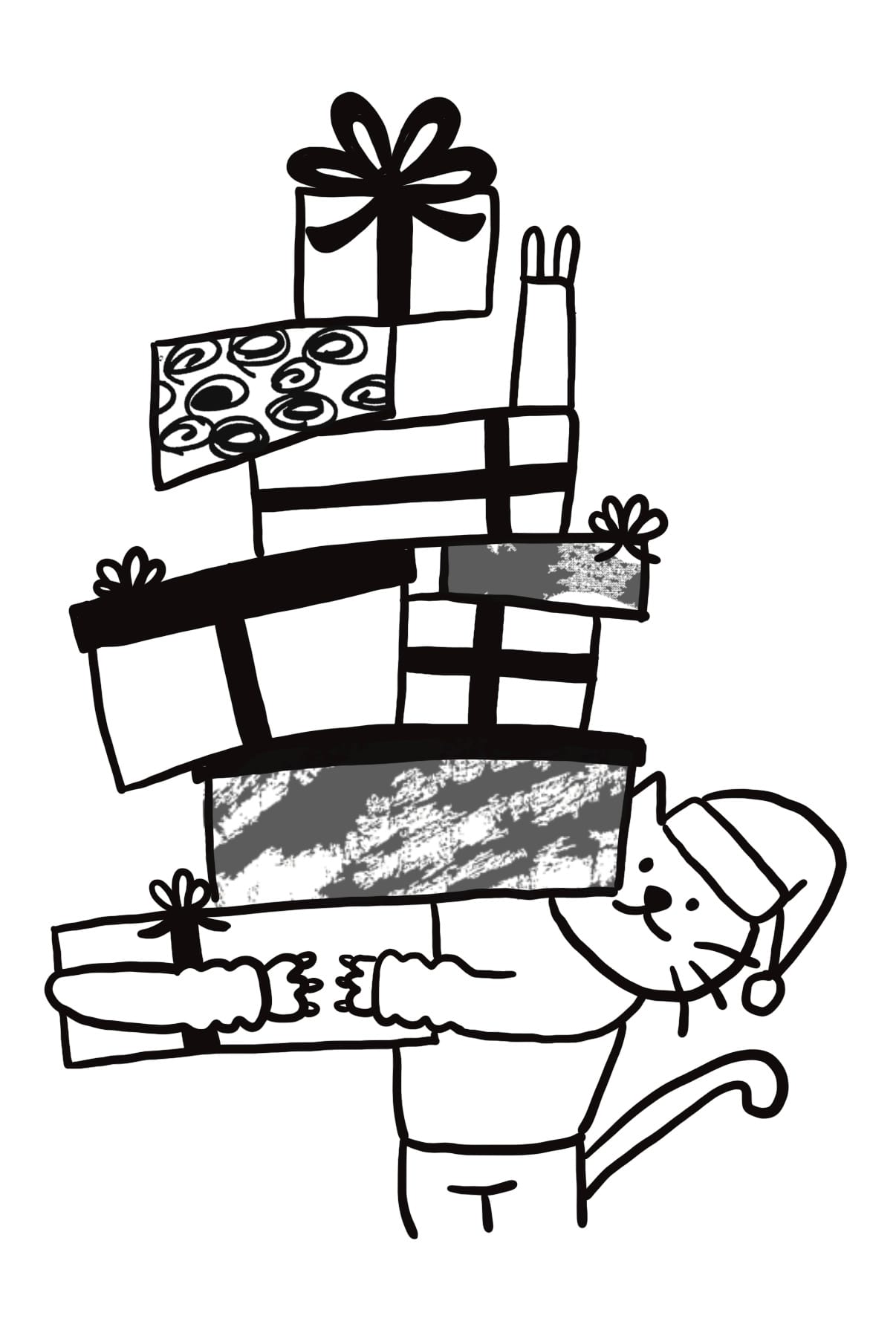 最初のスケッチでは、ゆるっとした人型キャラしか思いつかなかったのですが、別案で女の子を描いてみたところ、「雪だるまとダンス」で既に登場させていたので、何か違うキャラを…と思い出したのが、学生時代から20年以上落書きに登場している猫のMr.Cat! 長い手を使って大量のプレゼントを抱える彼に、主役を任せました。