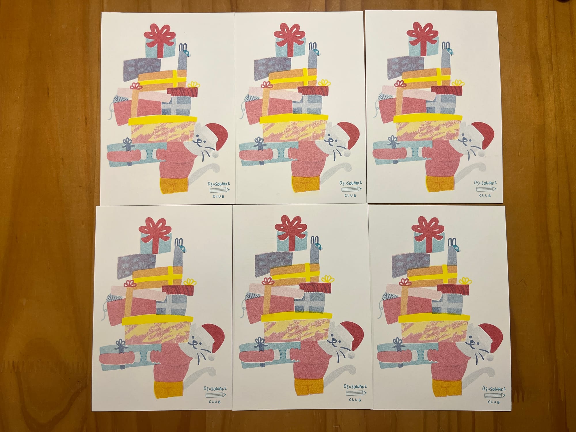 Mr. Cat shows up with arms full of gifts in this playful Osusowake Club holiday postcard. Let the festivities begin!