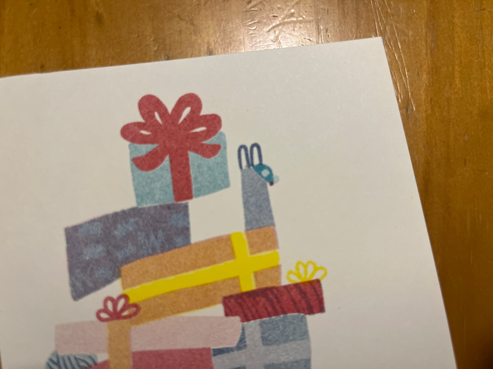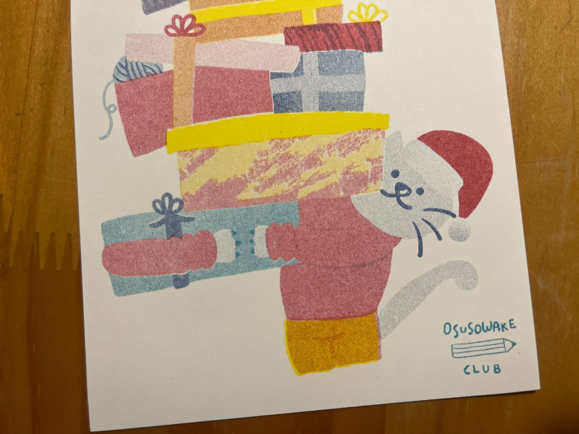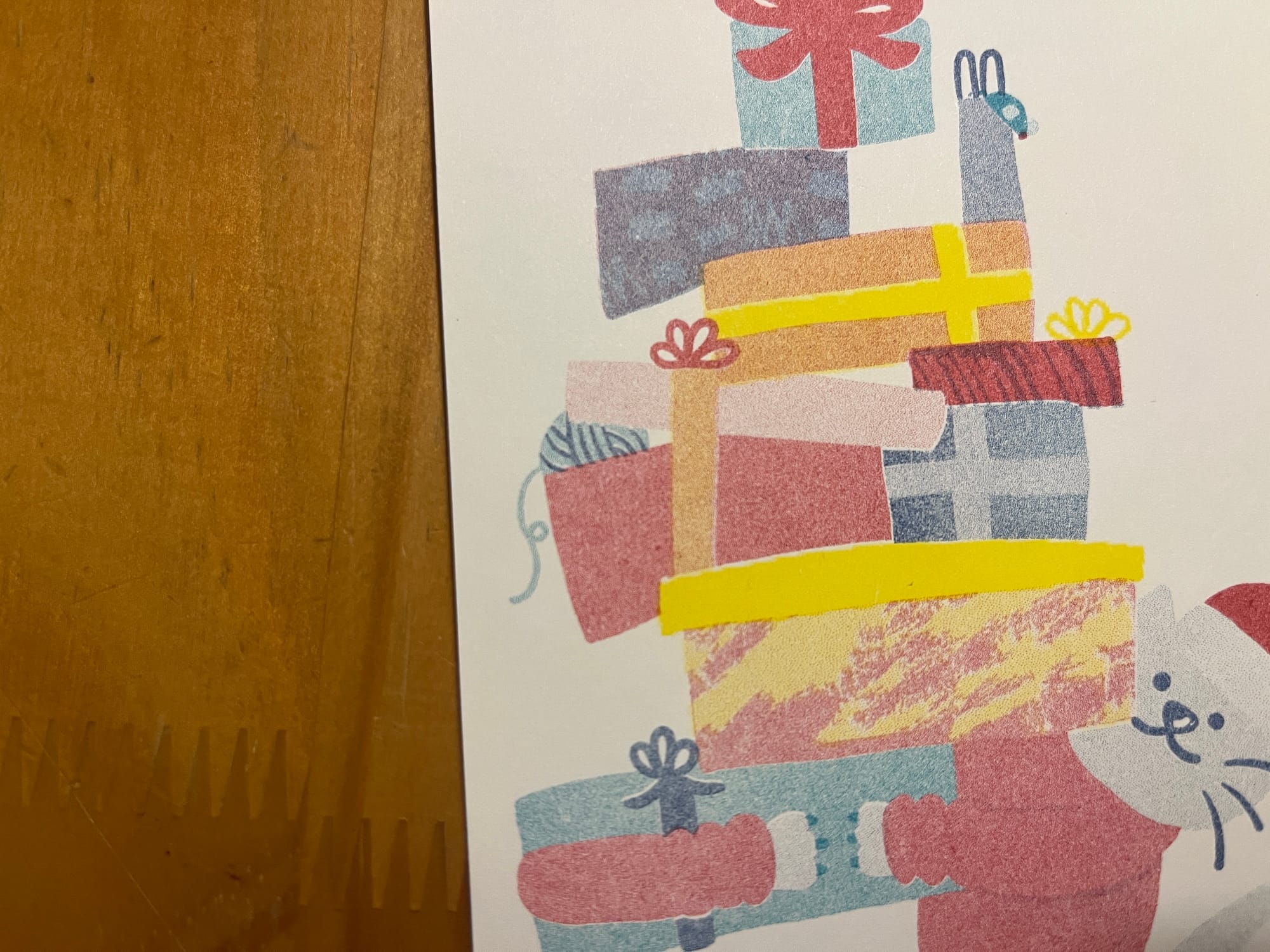 印刷では、もう少しインクを乗せてもよかったなという反省点もありますが、顔をひょっこりのぞかせているところや、しっかりプレゼントを抱えている手、飛び出しているネズミのおもちゃや毛糸など、細かい部分が可愛く表現できたので、満足しています。