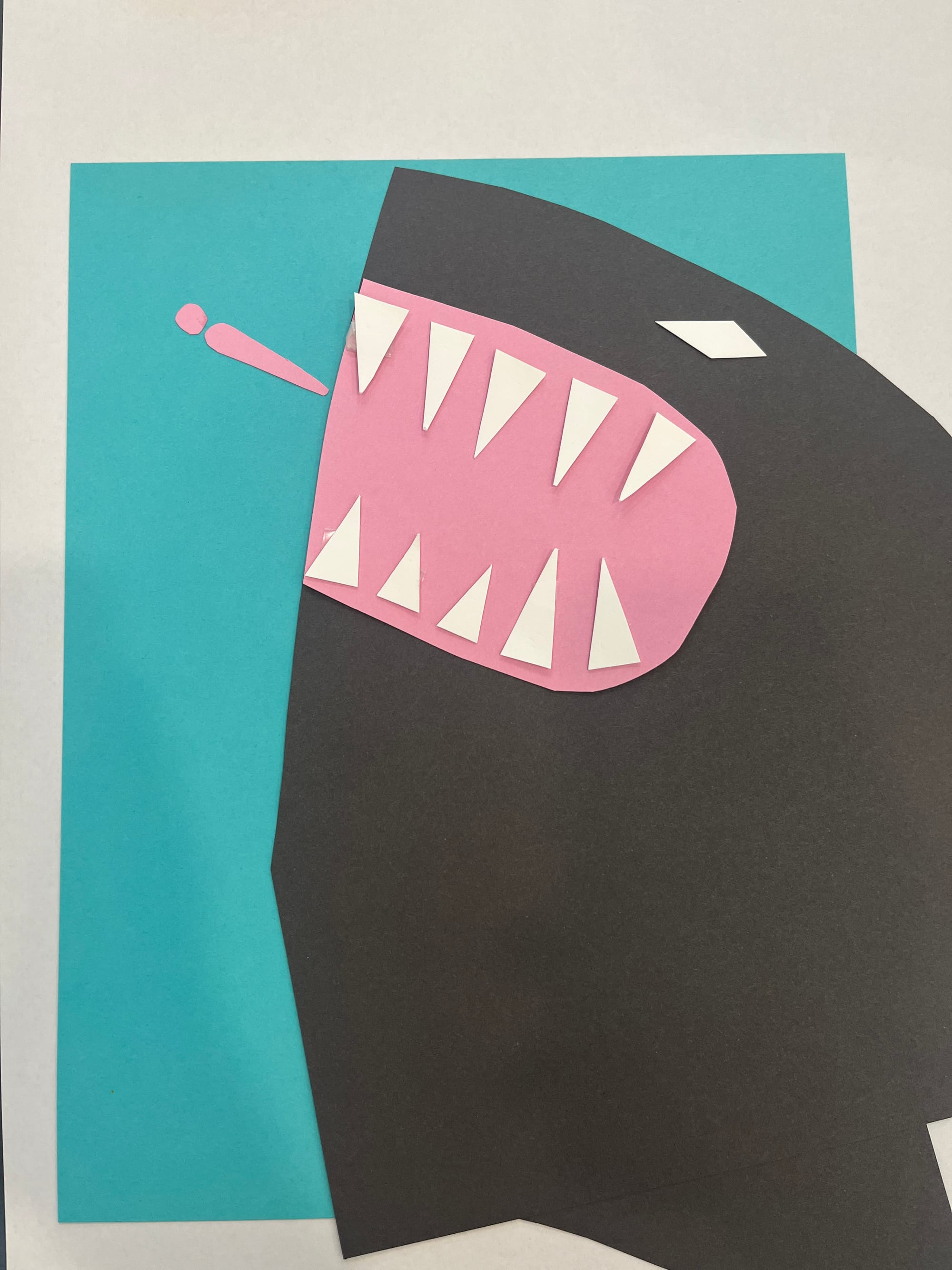 I chose four colors: white (required), pink, dark gray, and light blue. I started cutting and arranging shapes. My first version used pink for the shark’s gums, but it didn’t feel threatening enough. I switched to red, and it instantly felt more urgent and dramatic!