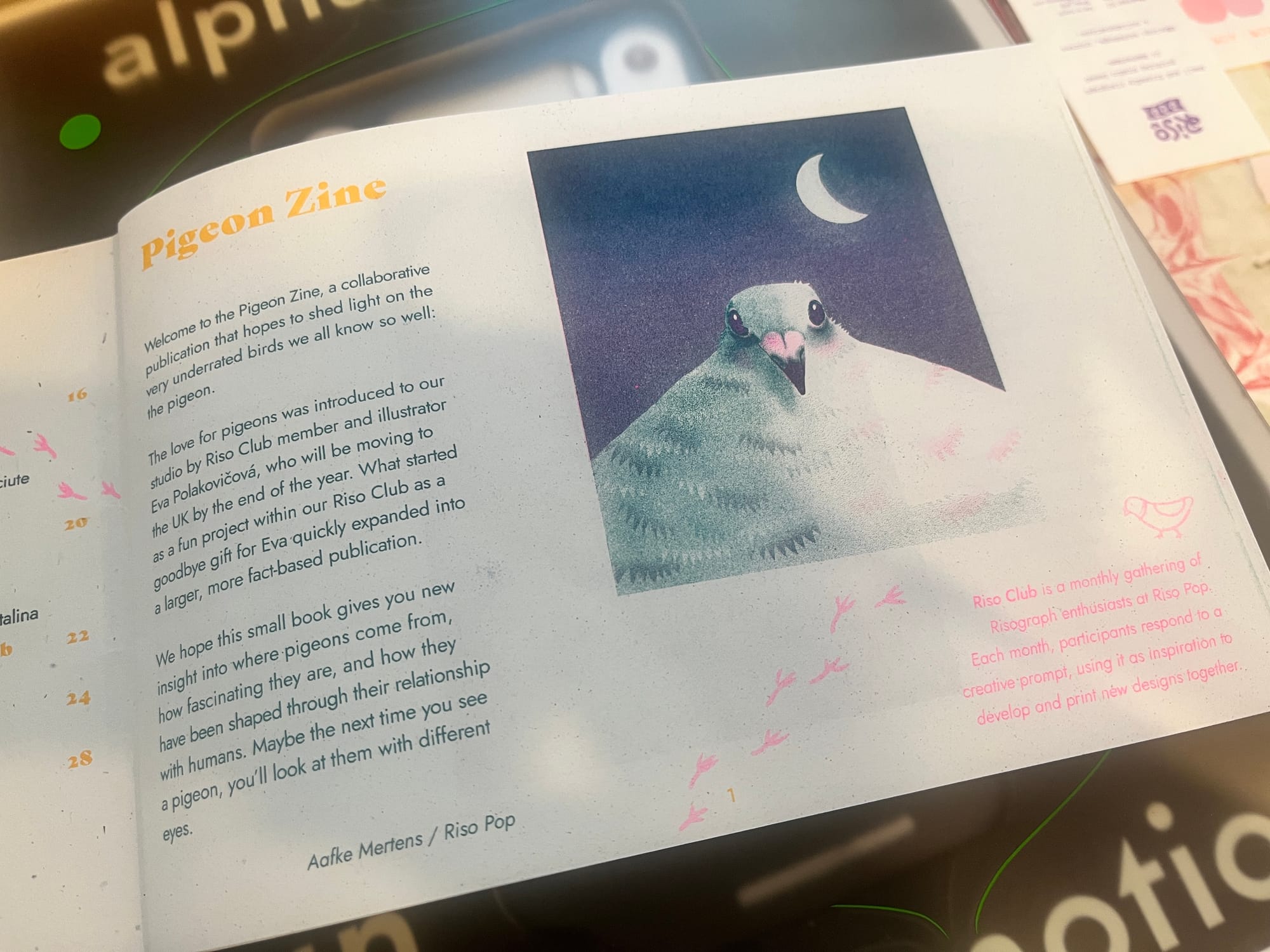 The one that immediately caught my eye was a zine about pigeons from RISO POP, a riso studio in Amsterdam. Over the past year, I’ve been hearing people talk about pigeons more and more—especially my husband and friends—so when I saw this zine released, I took it as a sign! The shipping ended up costing more than the zine itself, but I still went ahead and ordered it without hesitation—click!