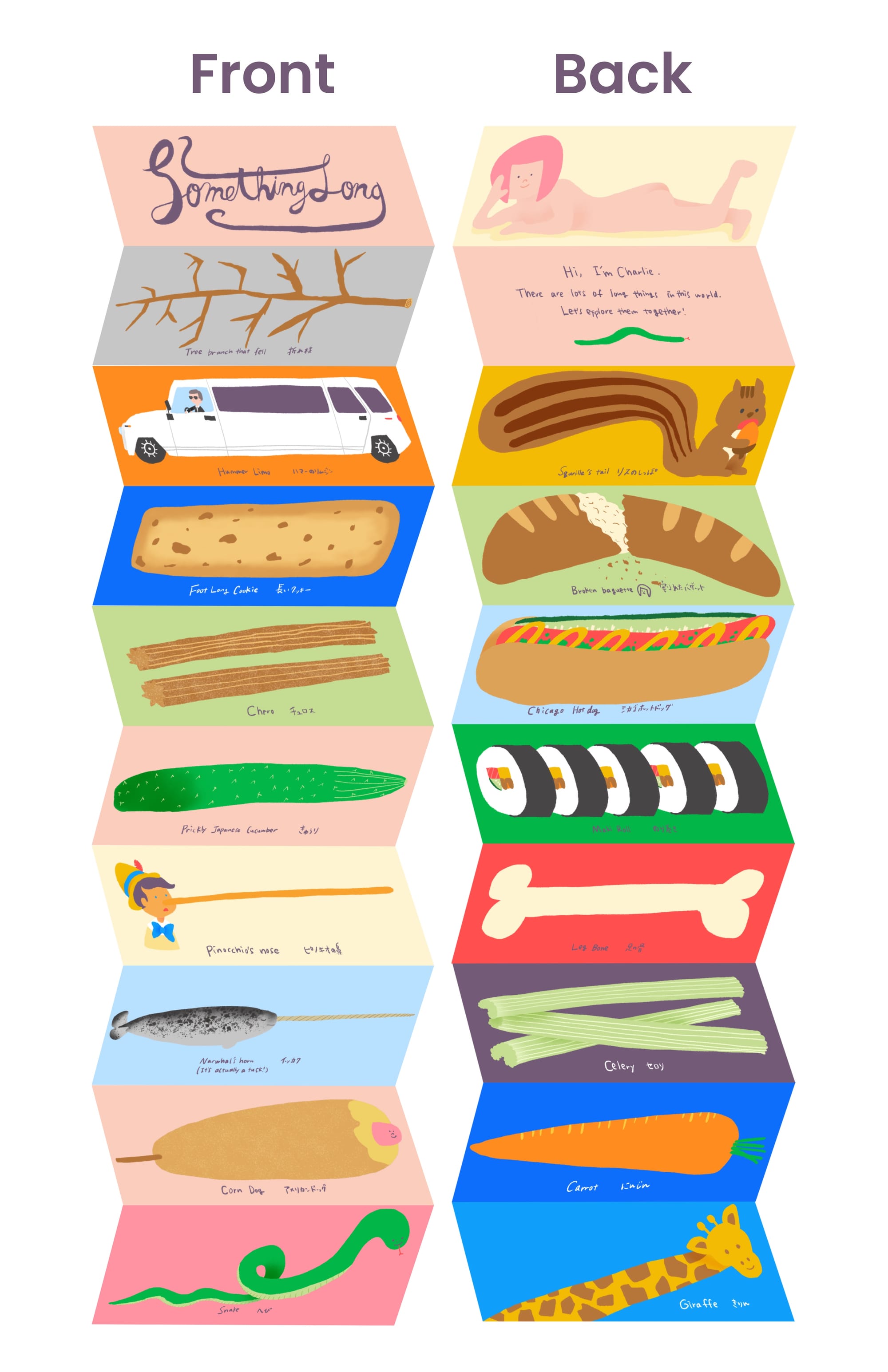 This project is a risograph zine titled Something Long. As the name suggests, I illustrated all sorts of things that are, well, long!