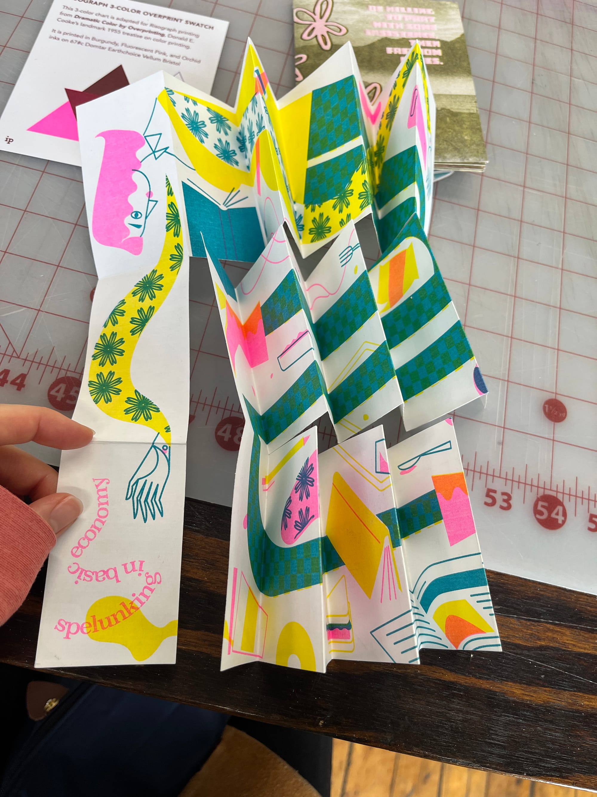 My husband and I took a risograph refresher course at Spudnik Press, and during that workshop, I saw a sample of a Snake Book format. That was the lightbulb moment! Once home, I grabbed a tabloid-sized sheet of paper, folded and sliced it, and created a horizontally long book that could be made from just one page. Perfect!