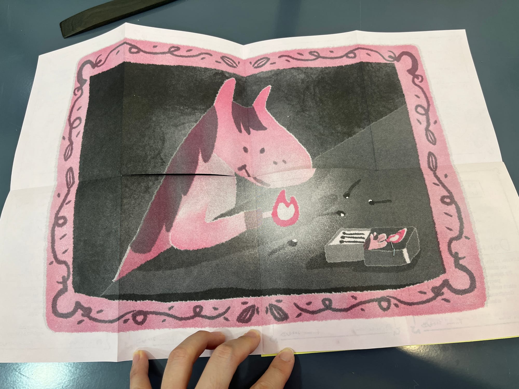 It felt like a shame to stop at just the individual fortunes, so I also created a companion zine featuring all eight omikuji designs. Since I was happy with my Fire Horse illustration, I included a duotone poster version of it on the back. It was printed in black and bubblegum pink using risograph. This time, I intentionally limited the ink colors because I wanted to experiment with yellow and soft pink paper and create something that felt different from my usual work.