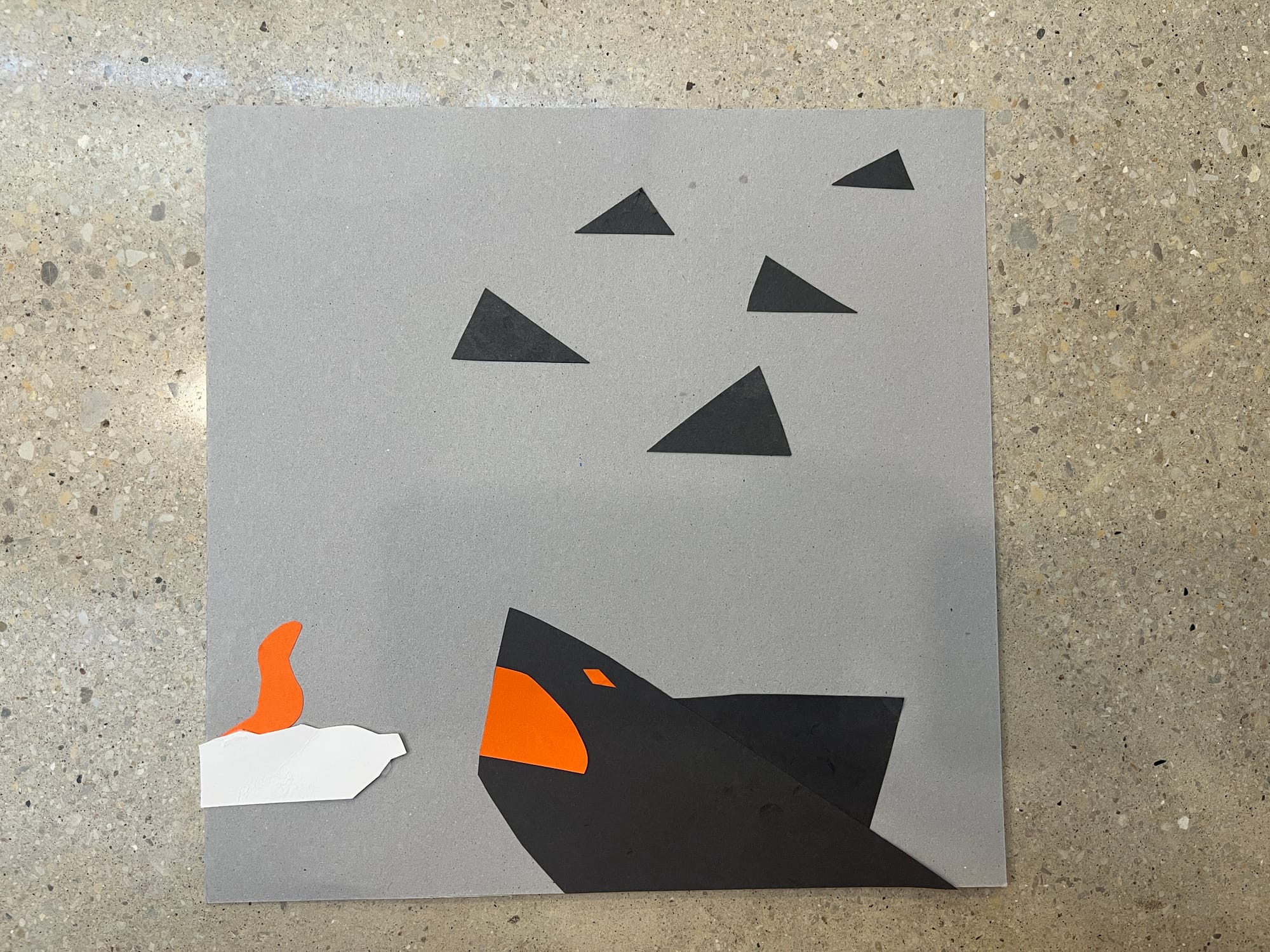 On Tuesday, I created a scene of a sea lion surrounded by sharks. I used diagonal lines to suggest movement and danger, pushed the sea lion to the edge of the composition to create a sense of being cornered, and played with size contrast—distant small fins and close-up large fins—to show depth. The sharp shark fins versus the sea lion’s rounded body also added to the tension. I wanted to create that sense of doom: even if the sea lion escapes one shark, there are plenty more waiting...