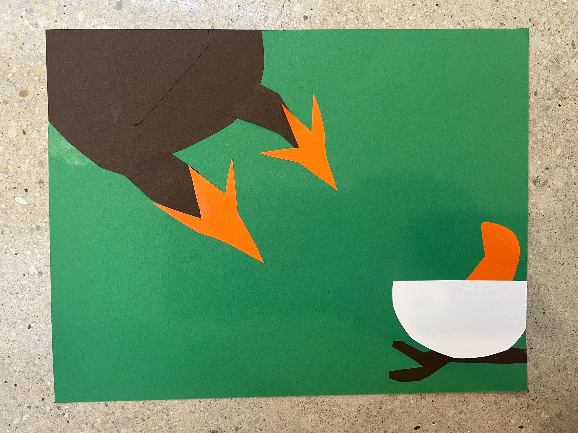 On Wednesday, I took on the moment a hawk’s talons swoop down on a small bird. Choosing colors was tricky, especially how to use white. I ended up using white for the nest to suggest innocence and safety—like an egg. I used horizontal tree branches to create a calm, grounded feeling. Only showing the hawk’s legs made the predator feel massive, and I placed the tiny bird near the edge to heighten the urgency. I also chose a darker green for the background to help the orange of the bird and talons stand out more clearly.