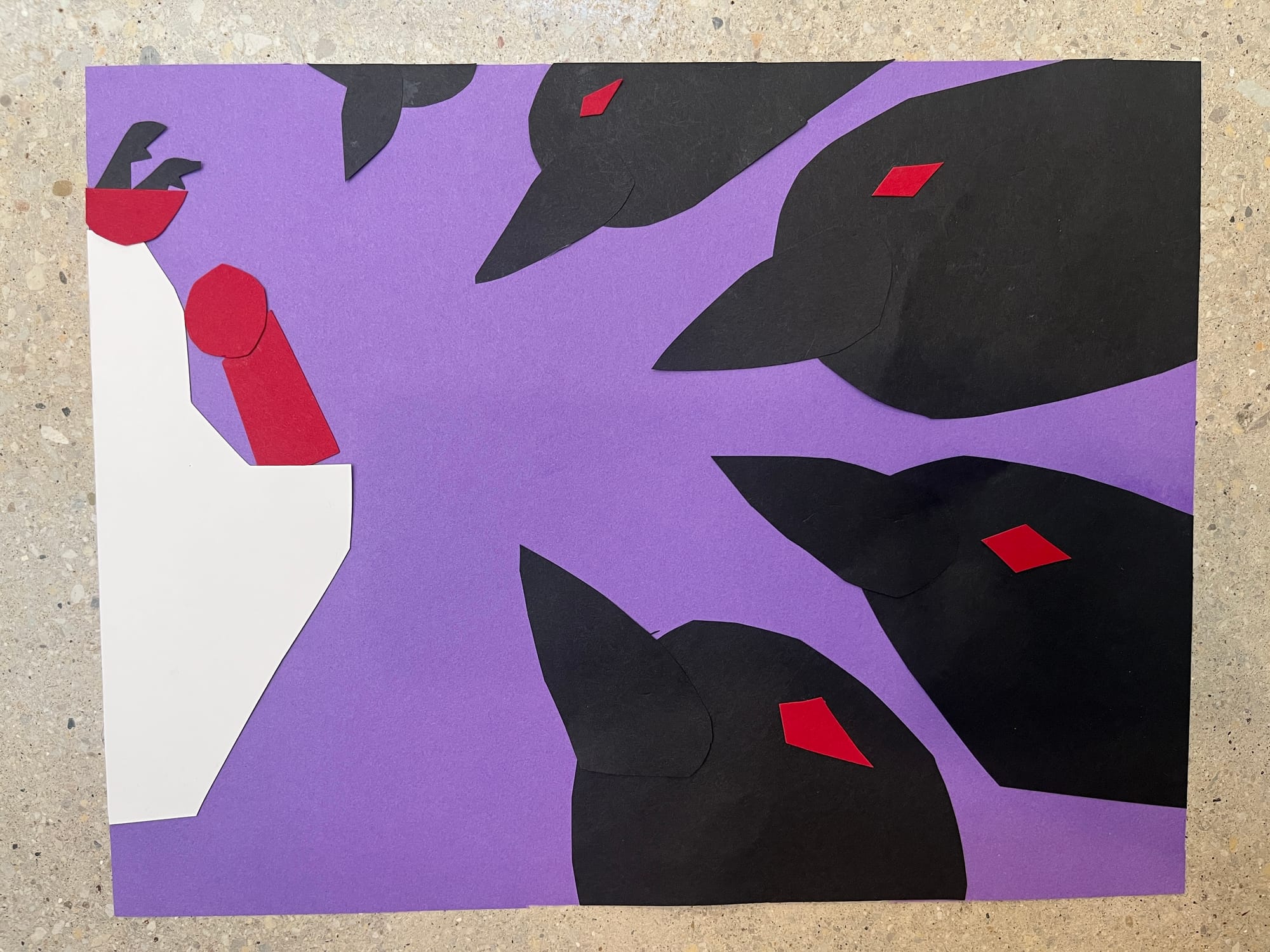 This week, I’ve been working on the Picture This exercise that I mentioned earlier—every day since Monday! The challenge? Create a visual that evokes fear using only four sheets of colored paper and a pair of scissors. The prompt: